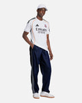 El escudo del Real Madrid está bordado en el pecho, acompañado del logo de adidas en contraste y las icónicas tres rayas en los hombros, para un look auténtico digno de campeones.